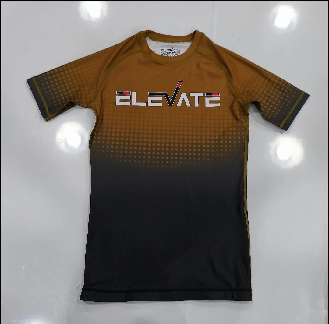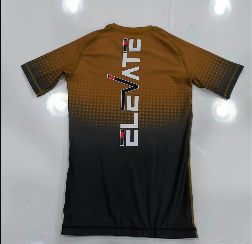 “Introducing our premium brown-ranked BJJ rashguard, designed for durability and comfort. Featuring a sleek gradient design transitioning from brown to black with modern accents, it’s perfect for both training and competition. Made from high-quality moisture-wicking material, it ensures optimal performance and comfort. The ‘Elevate’ logo adds a stylish touch, symbolizing growth and progression in your martial arts journey. Ideal for practitioners of Brazilian Jiu-Jitsu at the brown belt level.”